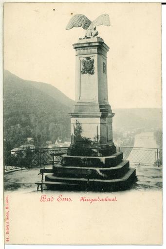 | Keywords: 00044-Bad Ems-1898-Kriegerdenkmal-Brück & Sohn Kunstverlag.jpg Bad Ems; Kriegerdenkmal Brück Sohn 00044 yes 1898 own Brück Sohn Kunstverlag Meißen cc-zero War memorials in Rhineland-Palatinate Park benches in Germany Lahn in Bad Ems Bridges in Bad Ems 1898 postcards of Rhineland-Palatinate 1898 postcards published by Brück Sohn Postcards of Bad Ems published by Brück Sohn Images from Brück Sohn Uploaded with VicuñaUploader Memorials in Bad Ems | ||||