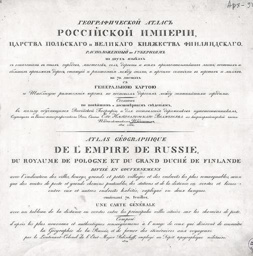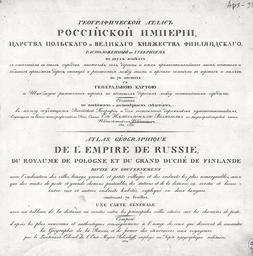 | Keywords: -000 Geographic atlas of the Russian Empire is located in governorates.jpg en Geographic atlas of the Russian Empire Kingdom of Poland and Grand Duchy of Finland is located in governorates in the Russian and French 1821 ru Геог афический атлас Российской импе ии Ца ства Польского и Великого княжества Финляндского асположенный по губе ниям на усском и ф анцузском языках 1821 год Титульный лист fr Atlas Geografique de L Empire de Russie du Royaume de Pologne et du Grand Duche de Finlande divise en Gouvernemens 1821 http //rutracker org/forum/viewtopic php t 600838 Пядышев Военно-Ка тог афическое Депо 1821 PD-old Geographic Atlas of the Russian Empire Kingdom of Poland and Grand Duchy of Finland 1820-1827 |
