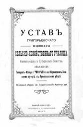 | Keywords: 001 Ustav Grigorievskogo Uchilischa Titul.jpg ru Устав Г иго ьевского сельскохозяйственного училища Титульный лист Уставъ Г иго ьевскаго низшаго сельско-хозяйственнаго Училища ижего одскаго Губе нскаго Земства имени Гене алъ- аіо а ГРИГОРЬЕВА на Обуховскомъ Земскомъ хуто ѣ въ Лукояновскомъ уѣздѣ Почтовый ад есъ ст Ташинъ заводъ ижего губ - ижній- овго одъ Типог афія К Филипповой 1911 - 20 с ижего одское Губе нское Земство 1911 PD-old-70 Charter of Grigorievsky agricultural school in Nizhny Novgorod province |