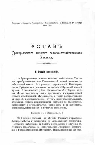 | Keywords: 002 Ustav Grigorievskogo Uchilischa Str 01.jpg ru Устав Г иго ьевского сельскохозяйственного училища С 1 Уставъ Г иго ьевскаго низшаго сельско-хозяйственнаго Училища ижего одскаго Губе нскаго Земства имени Гене алъ- аіо а ГРИГОРЬЕВА на Обуховскомъ Земскомъ хуто ѣ въ Лукояновскомъ уѣздѣ Почтовый ад есъ ст Ташинъ заводъ ижего губ - ижній- овго одъ Типог афія К Филипповой 1911 - 20 с ижего одское Губе нское Земство 1911 PD-old-70 Charter of Grigorievsky agricultural school in Nizhny Novgorod province |