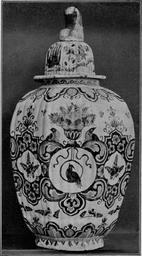 | Keywords: 0077 Potiche.jpg Artwork Cornelis Albrecht de Keizer fl 1668 Delft 1668 earthenware cm 51 Unknown object history between 1907-05-13 1907-05-15 sale F W Ross La Haye A Durand Paris Successions de Hoorn de Groningue Le trésor de la corporation des bouchers à Dordrecht provenant de M C BOSMAN van Oudkarspel De Brakke Grond Amsterdam 77 unknown ˜Potiche godronnée à huit pans de superbe qualité polychrome Sur quatre côtés des médaillons surmontés d ™un vase rempli de fleurs et d ™où suspend à des rubans un anneau dans lequel est assis un perroquet deux cacetous accostent le vase de fleurs Les quatre autres côtés à cartouches décorés de fleurs de cérisier sur un fond vert dans les réserves blanches aussi des fleurs de cérisiers Bordure au col et au pied à feuilles en bleu sur fond en bleu foncé et feuilles rouges Le couvercle à décor de paons volants et de fleurs est surmonté d ™un lion assis Haut 51 cM Marque CK en monogr en bleu <math>\tfrac 10 6 \ </math> et 16 Conservation parfaite ™ exhibition history credit line CK monogram unknown ~ accession number J Schulman 1907 Collections F W Ross La Haye A Durand Paris Successions de Hoorn de Groningue Le trésor de la corporation des bouchers à Dordrecht provenant de M C BOSMAN van Oudkarspel Amsterdam s n p 6 Collections F W Ross La Haye A Durand Paris et al pl I recto jpg Full image PD-old-100 Collections F W Ross La Haye A Durand Paris et al Lot0077 Delftware |