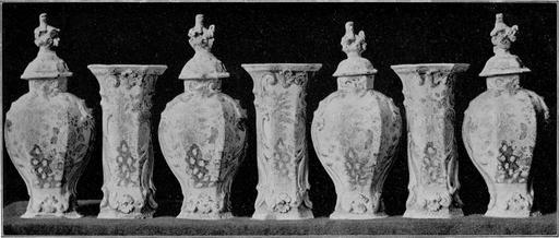 | Keywords: 0084 Seven Piece Cabinet Set.jpg Artwork Creator Anthoni Pennis 1759 earthenware cm 38 Unknown object history between 1907-05-13 1907-05-15 sale F W Ross La Haye A Durand Paris Successions de Hoorn de Groningue Le trésor de la corporation des bouchers à Dordrecht provenant de M C BOSMAN van Oudkarspel De Brakke Grond Amsterdam 84 unknown ˜Garniture de sept pièces de quatre potiches à couvercles et de trois cornets coin de jardin avec pivoines et autres fleurs riche cartouche Louis XV en relief beau décor bleu Haut 38 cM Quelques légères restaurations et endommagements aux bords des pieds ou des cols Un couvercle surmonté d ™un lion et trois couvercles surmonté d ™oiseaux Marque A P en monogr ™ exhibition history credit line A P monogram unknown ~ accession number J Schulman 1907 Collections F W Ross La Haye A Durand Paris Successions de Hoorn de Groningue Le trésor de la corporation des bouchers à Dordrecht provenant de M C BOSMAN van Oudkarspel Amsterdam s n pl IV Collections F W Ross La Haye A Durand Paris et al pl IV recto jpg Full image PD-old-100 Collections F W Ross La Haye A Durand Paris et al Lot0084 Anthoni Pennis |