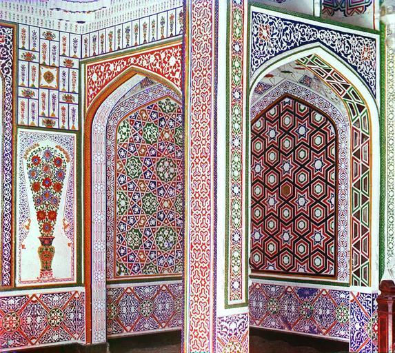 | Keywords: 01761u.jpg en Example of mosaics on the walls in the home of a wealthy Sart On the outskirts of Samarkand ru Об азцы мозаичных стен внут и дома богатого са та В ок естностях Сама канда LOC gorskii 1905-1915 Photos of Samarkand by Sergey Prokudin-Gorsky PD-Russia PD-1923 |
