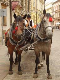 Keywords: 019KrakówKanonicza.JPG Kraków Poland Own 2007-07 Rj1979 Kanonicza Street in Kraków Bay horses Grey horses Carriages in Kraków Front views of horses Color comparisons of horses