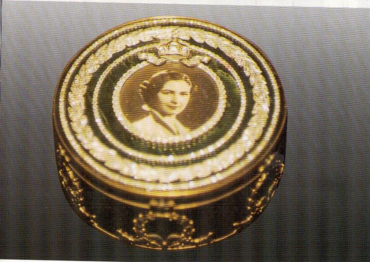 Keywords: متحف المجوهرات الملكية 02.jpg en علبة من العقيق محفوفة باطار من الذهب على غطائها صورة الملكة فريدة 1985-05-01 مجلد المتحف المجلس الاعلى للاثار other versions cc-zero Farida of Egypt Royal jewelry museum