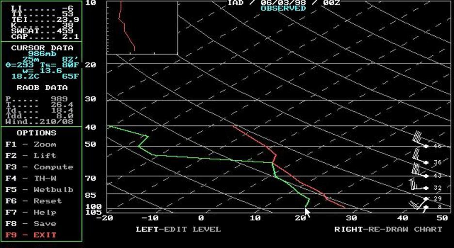 | Keywords: 03 June 1998 00z IAD Skew-T.jpg en Skew-T plot of an atmospheric profile at 00z on June 3 1998 around the time of the Frostburg Tornado Taken at IAD Dulles Airport by the NWS Sterling VA National Weather Service Sterling VA Dulles Airport NWS Sterling VA employees 1998-06-03 PD-USGov Tornadoes of 1998 Charts |