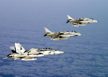 | Keywords: 040712-N-3799S-008.jpg en Atlantic Ocean July 10 2004 - Above the clouds over the Atlantic Ocean an F/A-18C Hornet assigned to the Sidewinders of Strike Fighter Squadron Eight Six VFA-86 flies in formation with two Italian AV-8B Harrier II+ assigned to the Italian Navy aircraft carrier ITS Giuseppi Garabaldi C 551 after conducting Dissimilar Air Combat Training DACT The aircraft are part of Majestic Eagle a multinational exercise being conducted off the coast of Morocco The exercise demonstrates the combined force capabilities and quick response times of the participating naval air undersea and surface warfare groups Countries involved in the U S -led exercise include the United Kingdom Morocco France Italy Portugal Spain and Turkey Truman's participation in Majestic Eagle is part of her scheduled deployment supporting the Navy's new fleet response plan FRP Summer Pulse 2004 the simultaneous deployment of seven carrier strike groups CSGs demonstrating the ability of the Navy to provide credible combat across the globe in five theaters with other U S allied and coalition military forces U S Navy photo by Lt Perry Soloman RELEASED http //www news navy mil/view_single asp id 16226 2004-07-10 U S Navy photo by Lt Perry Soloman PD-USN 1-11 aircraft Giuseppe Garibaldi C 551 F/A-18C Hornet in flight Strike Fighter Squadron 86 United States Navy MEDSHARK-Majestic Eagle 2004 Summer Pulse 2004 1-13 aircraft |