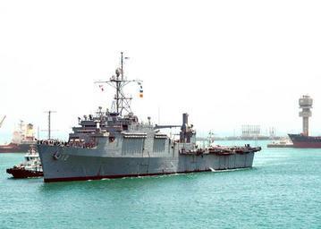 Ash Shuaybah, Kuwait, August 8, 2004 ñ Amphibious transport ship USS Shreveport (LPD 12) arrives in port in Kuwait, joining amphibious warfare ship USS Wasp (LHD 1) to backload Marines and cargo attached to the 22nd Marine Expeditionary Unit (Special Operations Capable). Wasp, Shreveport, and 22 MEU have been deployed since February as part of Expeditionary Strike Group 2 in support of the Global War on Terrorism. U.S. Navy photo by Photographerís Mate 3rd Class Teresa J. Ellison. (RELEASED)