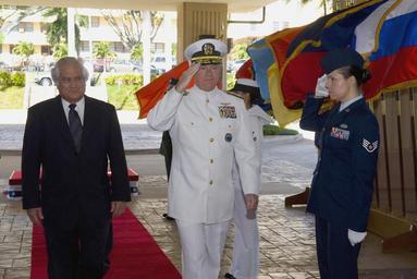 | Keywords: 080122-N-8623G-021.jpg 080122-N-8623G-021 CAMP SMITH Hawaii Jan 22 2008 Adm Timothy J Keating commander of U S Pacific Command salutes while walking through an honor cordon during the arrival of Tongonese Prime Minister Dr Feleti Sevele to the U S Pacific Command headquarters http //www navy mil/view_image asp id 54724 2008-01-22 U S Navy photo by Mass Communication Specialist 2nd Class Elisia V Gonzales Released PD-USGov-Military-Navy Feleti Sevele Timothy J Keating Salutes | ||||