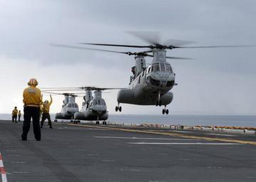 | Keywords: 081002-N-5215E-145.jpg en 081002-N-5215E-145 PACIFIC OCEAN Oct 2 2008 Sailors assigned to the forward-deployed amphibious assault ship USS Essex LHD 2 direct CH-46E Sea Knight helicopters onto the flight deck during a reconnaissance exercise The exercise included a total of 16 helicopters including seven Sea Knight helicopters from Marine Medium Helicopter Squadron 265 HMM-265 Essex is the lead ship of the only forward-deployed expeditionary strike group and serves as the flagship for CTF 76 the Navy's only forward-deployed amphibious force commander U S Navy photo by Mass Communication Specialist 3rd Class Matthew Ebarb/Released http //www navy mil/view_image asp id 64871U S Navy photo by Mass Communication Specialist 3rd Class Matthew Ebarb U S Navy photo by Mass Communication Specialist 3rd Class Matthew Ebarb 2008-10-02 PD-USGov-Military-Navy Images by Alaniaris/PD uploads CH-46 Sea Knight |