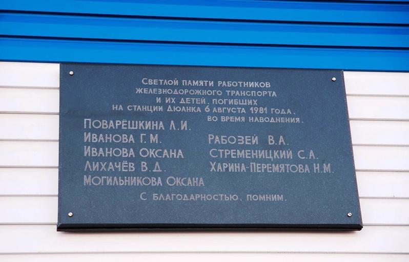| Keywords: Дюанка 08.jpg ru Памятная доска 2014 г own Ромашов Ге ман Викто ович other versions Памятная доска в память погибших жителях и аботниках станции п Дюанка Хаба овский к ай Ванинский -он п и наводнении 6 августа 1981 года п и п охождении тайфуна Филис cc-zero Plaques to be categorised by country |