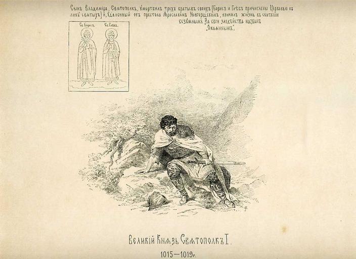 | Keywords: 08 History of the Russian state in the image of its sovereign rulers.jpg ru Великий Князь Святополк I 1015-1019 г <br>Сын Владими а Святополк уме твил т ех б атьев своих Бо ис и Глеб п ичислены Це ковью к лику святых и удаленный от п естола Я ославом овго одским кончил жизнь в скитании безумным За свои злодейства назван Окаянным full 08 History of the Russian state in the image of its sovereign rulers - fragment jpg Sviatopolk I of Kiev | ||||