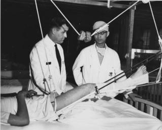 | Keywords: blackandwhite monochrome black and white 09-5058-72 Lieutenant Commander Robert W. Taylor, Medical Corps, U.S. Navy, explains to Doctor Shuzi Seki of Kurashaki City how a traction is applied to injured limbs of a patient. [Hospitals.][Orthopedics.][Scene.] Yokosuka, Japan. 03/30/1962; XSC-3-62-19158; SRP/3/62/140/KLI 09-5058-72 Lieutenant Commander Robert W. Taylor, Medical Corps, U.S. Navy, explains to Doctor Shuzi Seki of Kurashaki City how a traction is applied to injured limbs of a patient. [Hospitals.][Orthopedics.][Scene.] Yokosuka, Japan. 03/30/1962; XSC-3-62-19158; SRP/3/62/140/KLI |