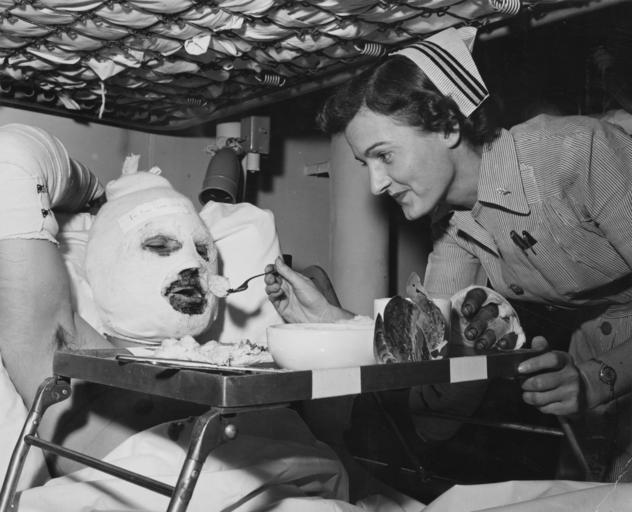| Keywords: blackandwhite monochrome black and white Inchon, Korea: Aboard USS Repose Thanksgiving Day. Lieutenant Junior Grade Weece Wood, Nurse Corps, U.S. Navy, assists Private 1st Class Jack W. Newman, U.S. Marine Corps, with his holiday dinner. [Wounds and injuries.][Korean War.][Food and drink.][Hospital ships. Transport of sick and wounded.][Scene.] 11/27/1952. Repose (AH-16) Folder 2 - 09-5085-29 Inchon, Korea: Aboard USS Repose Thanksgiving Day. Lieutenant Junior Grade Weece Wood, Nurse Corps, U.S. Navy, assists Private 1st Class Jack W. Newman, U.S. Marine Corps, with his holiday dinner. [Wounds and injuries.][Korean War.][Food and drink.][Hospital ships. Transport of sick and wounded.][Scene.] 11/27/1952. Repose (AH-16) Folder 2 - 09-5085-29 |