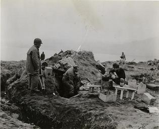 | Keywords: outdoor 09-7928-22 First Japs Defense on Attu Fall to Americans. American occupation of the outer ring of Jap defenses on Attu and aerial views of landings made in the combined Army and Navy operations are shown in these pictures made by Navy photographers, 05/17 to 05/21/1943. Examine equipment found in Underground Village - like prairie dog hills on the western plains of the United States with interlacing tunnels were dugouts in which the Japs in Holly Bay area lived until the Americans came to drive them out. U.S. sailors are looking over equipment of a Jap Medical Unit which occupied this hole in the ground. [Medical supplies.] [Soldiers.] [World War 2. Pacific Theater.] [Scene.] WWII Pacific Island Combat General. 05/28/1943 09-7928-22 First Japs Defense on Attu Fall to Americans. American occupation of the outer ring of Jap defenses on Attu and aerial views of landings made in the combined Army and Navy operations are shown in these pictures made by Navy photographers, 05/17 to 05/21/1943. Examine equipment found in Underground Village - like prairie dog hills on the western plains of the United States with interlacing tunnels were dugouts in which the Japs in Holly Bay area lived until the Americans came to drive them out. U.S. sailors are looking over equipment of a Jap Medical Unit which occupied this hole in the ground. [Medical supplies.] [Soldiers.] [World War 2. Pacific Theater.] [Scene.] WWII Pacific Island Combat General. 05/28/1943 |
