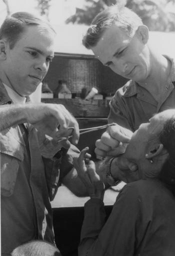 Keywords: blackandwhite monochrome black and white 09-7971-134 1st Military Air Wing. Easing pain -Hospital Corpsmen William R. Carpenter, left and Harold R. Minyard work together in the extraction of a decayed tooth from an elderly Vietnamese. The corpsmen treated more than 100 Vietnamese of Ky Chanh village, 10 miles north of the Marine Air Base, Chu Lai. [Vietnam War.] [Scene.] Vietnam - Treating Civilians. 09-7971-134 1st Military Air Wing. Easing pain -Hospital Corpsmen William R. Carpenter, left and Harold R. Minyard work together in the extraction of a decayed tooth from an elderly Vietnamese. The corpsmen treated more than 100 Vietnamese of Ky Chanh village, 10 miles north of the Marine Air Base, Chu Lai. [Vietnam War.] [Scene.] Vietnam - Treating Civilians. |