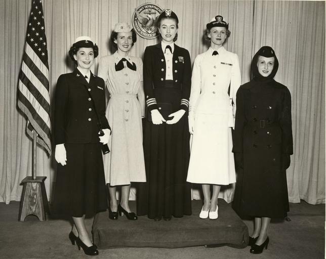 Keywords: waves uniform fashion groupshot people indoor monochrome 09-8051-9 Modified uniforms for women of the Naval Service featured at Pentagon showing. Six of six. The 'new look' in uniforms for the women of the Naval service. Main feature of the new, modified uniforms are longer skirts and the replacement of the blue braid on officer's uniforms by the conventional gold braid, such as is worn by the male officers. Above are, left to right, Miss Sylvia Marsen, Yeoman, 2nd Class, of Manhattan, New York, modeling the blue uniform; Miss Margaret Kane, Personnel man, 1st Class, of Flushing, Long Island, New York, modeling the gray summer working uniform; Miss Florence Knaus, of Teaneck, New Jersey, a Mainbocher model, displaying the evening dress uniform; Miss Helen Hamilton, of Caro, Michigan, a Mainbocher model, showing the white dress uniform, and Miss Doris Miller, Yeoman 2nd Class, of Massapequa Park, New York. [Uniforms.] [Women.] [Scene.] WAVES [Women Accepted for Volunteer Emergency Services ] Photos (misc.)10/25/1948; File Number 706257. 09-8051-9 Modified uniforms for women of the Naval Service featured at Pentagon showing. Six of six. The 'new look' in uniforms for the women of the Naval service. Main feature of the new, modified uniforms are longer skirts and the replacement of the blue braid on officer's uniforms by the conventional gold braid, such as is worn by the male officers. Above are, left to right, Miss Sylvia Marsen, Yeoman, 2nd Class, of Manhattan, New York, modeling the blue uniform; Miss Margaret Kane, Personnel man, 1st Class, of Flushing, Long Island, New York, modeling the gray summer working uniform; Miss Florence Knaus, of Teaneck, New Jersey, a Mainbocher model, displaying the evening dress uniform; Miss Helen Hamilton, of Caro, Michigan, a Mainbocher model, showing the white dress uniform, and Miss Doris Miller, Yeoman 2nd Class, of Massapequa Park, New York. [Uniforms.] [Women.] [Scene.] WAVES [Women Accepted for Volunteer Emergency Services ] Photos (misc.)10/25/1948; File Number 706257. |