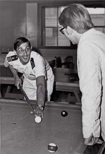 Keywords: history mental health mentalhealth blackandwhite black and white 09-8132-058 Lieutenant Commander Robert Downs (Nurse Corps, U.S. Navy), a psychiatric nurse at National Naval Medical Center, plays pool with a psychiatric patient as part of the therapy. [Nurses. Nursing.] [Scene.] Nurse Corps - Medical Activities. 03/1976; Photograph Number 763360. 09-8132-058 Lieutenant Commander Robert Downs (Nurse Corps, U.S. Navy), a psychiatric nurse at National Naval Medical Center, plays pool with a psychiatric patient as part of the therapy. [Nurses. Nursing.] [Scene.] Nurse Corps - Medical Activities. 03/1976; Photograph Number 763360. |