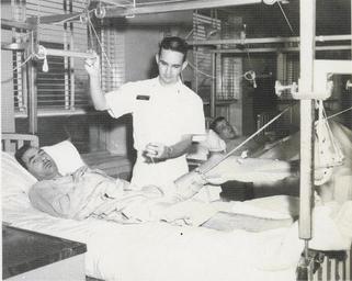| Keywords: outdoor 09-8645-1 A patient has his traction adjusted by Lieutenant Junior Grade Jerry McClelland, a new nurse on the staff at the Naval Hospital Portsmouth, Virginia. When men were first permitted to join the Navy Nurse Corps in 1965 they were primarily used in orthopedic, urology and neuropsychiatric wards. Before the transition of men into the nursing community, heated discussion between the Navy's Bureau of Medicine and Surgery and the Bureau of Personnel took place to decide how to use this new resource. [Portraits.] [Splints (Surgery). Orthopedic apparatus.] [Nurses. Nursing.] [Scene.] Jerry McClelland. 09-8645-1 A patient has his traction adjusted by Lieutenant Junior Grade Jerry McClelland, a new nurse on the staff at the Naval Hospital Portsmouth, Virginia. When men were first permitted to join the Navy Nurse Corps in 1965 they were primarily used in orthopedic, urology and neuropsychiatric wards. Before the transition of men into the nursing community, heated discussion between the Navy's Bureau of Medicine and Surgery and the Bureau of Personnel took place to decide how to use this new resource. [Portraits.] [Splints (Surgery). Orthopedic apparatus.] [Nurses. Nursing.] [Scene.] Jerry McClelland. |