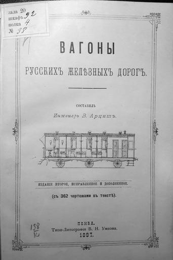 | Keywords: россия russia железная дорога железнаядорога railway old time oldtime вагон blackandwhite monochrome text writing black and white Арциш В.А. Вагоны русских железных дорог /Сост. инж. В. Арциш. - 2-е изд., испр. и доп.. - Пенза : типо-лит. В.Н. Умнова, 1897. - 254, II с., 362 черт. ; 22 см Арциш В.А. Вагоны русских железных дорог /Сост. инж. В. Арциш. - 2-е изд., испр. и доп.. - Пенза : типо-лит. В.Н. Умнова, 1897. - 254, II с., 362 черт. ; 22 см | ||||