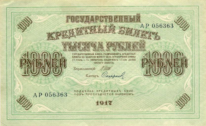 | Keywords: 1000 рублей 1917 года. Аверс.jpg 1000 ублей ке енками т н думка Лицевая сто она В еменное п авительство России 1917 http //www russian-money ru/ 1917 currency Original upload log ru wikipedia ftcg page ru wikipedia 1000_ D1 80 D1 83 D0 B1 D0 BB D0 B5 D0 B9_1917_ D0 B3 D0 BE D0 B4 D0 B0 _ D0 90 D0 B2 D0 B5 D1 80 D1 81 jpg wikitable - 19 25 31 January 2011 2 504 × 1 537 2 116 344 bytes Knyaz-1988 w ru <nowiki> Изоб ажение Описание 1000 ублей Аве с Авто В еменное п авительство России В емя создания 1917 г Источник http //www russian</nowiki> Banknotes of Russia 1917 Banknotes with a face value of 1000 Green banknotes |