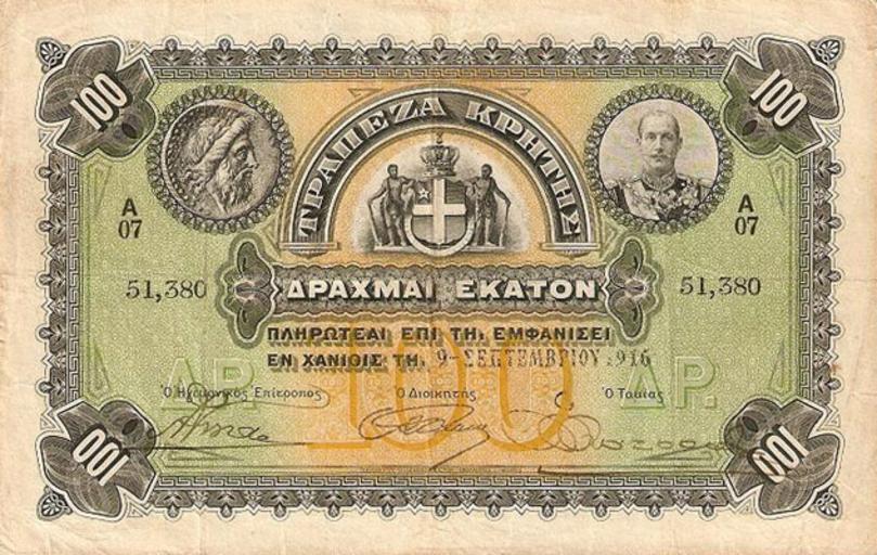 Keywords: 100 drachmas banknote, Cretan State, front view.jpg el Έμ ροσθεν όψη του χαρτονομίσματος των 100 δραχμών της Κρητικής Πολιτείας en 100 drachmas banknote Cretan State front view 1901 1917 http //www greekbanknotes com/greek-banknotes/bank_of_crete/ author other versions Custom license marker 2016 07 02 PD-old PD-1923 Cretan state banknotes |