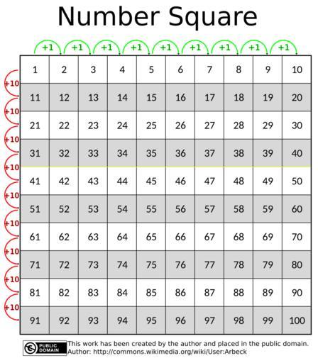 | Keywords: 100 Number Square.svg en A number square in base 10 This is a useful aid to help young children learn how to count and use decimals 2013-01-16 11 30 13 own Ant Beck cc-zero Uploaded with UploadWizard Numbers Teaching Learning Counting Subtraction |