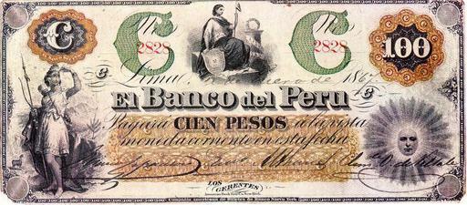 Keywords: 100 peruvian pesos.jpg Note for 100 peso of the Peru Bank Own 1863 Ernesto Linares Banknotes of Peru Banknotes with a face value of 100 Persons on banknotes Sun in art