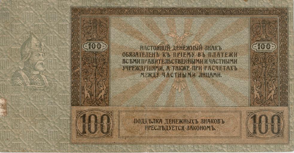 | Keywords: 100 Rublos cosacos 1918 back.jpg Банкнота Донской области достоинством 100 ублей об азца 1918 года Всевеликое Войско Донское Обо отная сто она Изоб ажён Е мак Тимофеевич Естественные цвета в максимальном аз ешении en Russian Don banknote 100 rubles 1918 year Back scanned note from own personal collection 1918 Bank of Rostov/П авительство Донской области/Ростовская конто а Госбанка 1918 currency Banknotes of Don 1918 Banknotes with a face value of 100 Yermak Brown banknotes | ||||