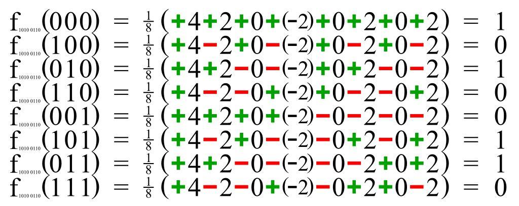 Keywords: 1010 0110 Walsh spectrum (polynomial).svg A 3-ary Boolean function <math>f x_1 ~x_2 ~x_3 </math><br> can be expressed by means of the Walsh spectrum <math> r_0 ~r_1 ~r_2 ~r_3 ~r_4 ~r_5 ~r_6 ~r_7 </math><br> as an arithmetical polynomial <math>f~ x_1 x_2 x_3 ~~~~ ~~~~\tfrac 1 8 ~~\bigg ~~r_0 + r_1 -1 x_1 + r_2 -1 x_2 + r_3 -1 x_1 \oplus x_2 </math><br> <math>+ r_4 -1 x_3 + r_5 -1 x_1 \oplus x_3 + r_6 -1 x_2 \oplus x_3 + r_7 -1 x_1 \oplus x_2 \oplus x_3 ~~\bigg </math> <math>~\oplus~</math> stands for the modulo-2 addition Compare Definition 8 page 2 of the PDF in http //matwbn icm edu pl/ksiazki/amc/amc13/amc13413 pdf The spectral test of the Boolean function linearity by P Porwik own mate2code Walsh spectrum of 3-ary Boolean functions Walsh matrix of order 8 |