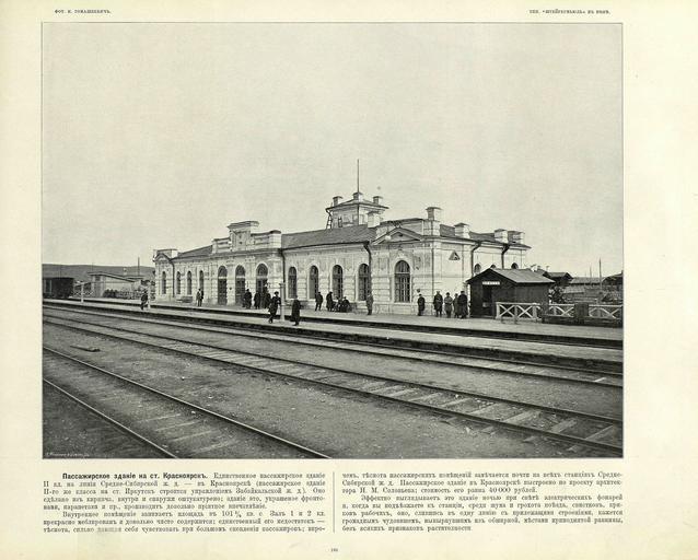 | Keywords: 101 Пассажирское здание на ст Красноярск.jpg en «Great Path - Views of Siberia and Great Siberian Railway» book 1899 ru Альбом «Великий путь Виды Сиби и и Великой сиби ской железной до оги» 1899 1899 flickr photos by I R Tomaskiewicz comments by V A I-v Custom license marker 2014 04 08 PD-RusEmpire PD-old Great Path - Views of Siberia and Great Siberian Railway Uploaded with UploadWizard | ||||