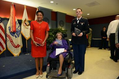 | Keywords: 106-year-old Army WWII veteran honored 140331-D-BN624-212.jpg en From left to right Tracey Pinson director of the Army's Small Business Program; World War II Army veteran Alyce Dixon; and Sexual Assault Prevention advocate Spc Natasha Schuette hold their awards for their exceptional character courage and commitment to Army values at a women's history month event at the Pentagon March 31 2014 2014-03-31 Lisa Ferdinando https //www dvidshub net/image/1330814 140331-D-BN624-212 2014-05-11 00 29 WASHINGTON DC US PD-USGov Alyce Dixon Women's History Month 2014 Images from DoD uploaded by Fæ |