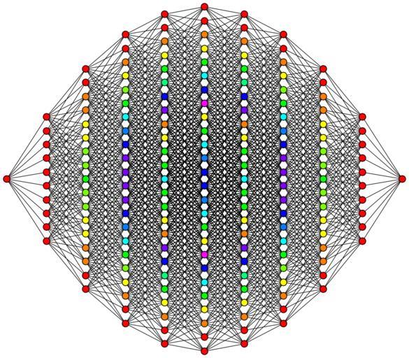 | Keywords: 10-cube column graph.svg 10-hypercube 10-cube graph This hypercube graph is an orthogonal projection This oriented projection shows columns of vertices positioned a vertex-edge-vertex distance from one vertex on the left to one vertex on the right and edges attaching adjacent columns of vertices The number of vertices in each column represents rows in Pascal's triangle being 1 10 45 120 210 252 210 120 45 10 1 in the case of this 10-cube Note Starting with the tesseract the orthogonal projection shows vertices overlapping The counts of vertices at each 2d location are represented by colors red orange yellow green etc own Geoff Richards Qef 2008-07-23 Old bitmap version en Image 10-cube_column_graph gif Source code See en User Qef/Orthographic hypercube diagrams Qef Hypercube graphs 2-fold rotational symmetry Geometry images with dihedral symmetry 02 |