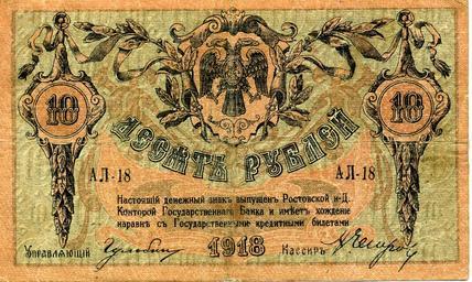 | Keywords: 10 Roubles cossacks 1918 back.jpg en Russian Don banknote 10 rubles 1918 year Back ru Банкнота Донской области достоинством 10 ублей об азца 1918 года scanned note from own personal collection П авительство Донской области/Ростовская конто а Госбанка 1918 1918 currency Banknotes of Don 1918 Banknotes with a face value of 10 1918 in Russia |
