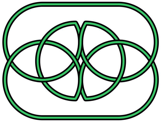 | Keywords: 10crossings-two-triquetras-joined.svg A 10-crossing ornamental knot made from circular arcs such that the center of each circle is on the circumference of two other circles i e vesica piscis geometry This means that there is the visual appearance of two triquetras Equivalent to mathematical knot 10<sub>122</sub> Self-made image converted from the following PostScript source code <pre> 406 396 translate 6 dup scale/x 240 3 sqrt div neg def/y x 120 3 sqrt mul add def/w x 64 308 sub def/z w 120 3 sqrt mul sub def 1 setlinejoin -90 rotate 0 w 240 360 180 arcn -120 z 240 120 90 arcn -120 y 240 -90 180 arc -120 z 240 -180 90 arc -120 y 240 -90 -120 arcn 0 x 240 180 0 arcn 120 y 240 300 270 arcn 120 z 240 90 360 arc 120 y 240 0 270 arc 120 z 240 90 60 arcn closepath gsave 32 setlinewidth 0 setgray stroke grestore 12 5 setlinewidth 2 8 4 setrgbcolor stroke 32 setlinewidth 0 setgray 120 y 240 250 270 arc 120 z 240 90 68 arcn stroke -120 y 240 292 308 arc stroke 120 y 240 172 188 arc stroke 0 w 240 248 232 arcn stroke 120 z 240 112 128 arc stroke -120 z 240 70 90 arc -120 y 240 -90 -110 arcn stroke -120 z 240 -8 8 arc stroke 0 x 240 68 52 arcn stroke 120 z 240 232 248 arc stroke -120 y 240 52 68 arc stroke 2 8 4 setrgbcolor 12 5 setlinewidth 120 y 240 249 270 arc 120 z 240 90 67 arcn stroke -120 y 240 291 309 arc stroke 120 y 240 171 189 arc stroke 0 w 240 249 231 arcn stroke 120 z 240 111 129 arc stroke -120 z 240 69 90 arc -120 y 240 -90 -111 arcn stroke -120 z 240 -9 9 arc stroke 0 x 240 69 51 arcn stroke 120 z 240 231 249 arc stroke -120 y 240 51 69 arc stroke showpage EOF</pre> 2010 AnonMoos 10 crossing number knots and links Decorative knots Prime knots Images with PostScript source code Knots and links on transparent background Outline knots and links |