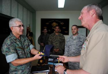 | Keywords: 110112-N-2984R-442 (5354392287).jpg U S Navy Cmdr Mark Becker right the mission commander for Southern Partnership Station 2011 right presents Ecuadorian Capitan de Fragata Dario Ortega Perez a ball cap during a visit to Base Naval de Jaramijo where a Marine Corps Training and Advisory Group team is holding a week-long exercise in support of Southern Partnership Station 2011 in Manta Ecuador Jan 12 2011 Southern Partnership Station is an annual deployment of U S ships to the U S Southern Command area of responsibility in the Caribbean and Latin America The exercise involves information sharing and training with navies coast guards and civilian services throughout the region DoD photo by Mass Communication Specialist 2nd Class Ricardo J Reyes U S Navy/Released https //www flickr com/photos/39955793 N07/5354392287/ 110112-N-2984R-442 2011-01-03 17 54 https //www flickr com/people/39955793 N07 U S Department of Defense Current Photos PD-USGov U S Department of Defense Current Photos https //flickr com/photos/39955793 N07/5354392287 2016-09-03 15 31 27 United States Government Work Manta Ecuador Navy people of Ecuador Southern Partnership Station 2011 |