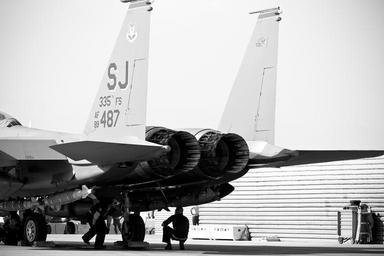 | Keywords: u.s. air force usairforce u.s. army usarmy rc east rceast rce oef operation enduring freedom operationenduringfreedom afghanistan bagram baf usaf air force airforce cas close air support closeairsupport military photo f-15e f15e strike eagle strikeeagle airman airmen maintenance army 335th fighter squadron fightersquadron 335th fighter squadron 335thfightersquadron strike eagle fighter squadron operation enduring freedom f-15 f15 afterburner take off airplane aircraft combat close air support aviation conflict pilot pilots weapons bombs creative commons royalty free public domain photograph digital matt hecht getty reuters ap blackandwhite monochrome black and white U.S. Air Force Airmen from Bagram Air Field, Afghanistan, perform maintenance on F-15E Strike Eagles on Sept 30, 2011. Strike Eagles are all-weather multirole fighters that provide close aire support for coalition troops. (U.S. Air National Guard photo by Tech. Sgt. Matt Hecht/Released) U.S. Air Force Airmen from Bagram Air Field, Afghanistan, perform maintenance on F-15E Strike Eagles on Sept 30, 2011. Strike Eagles are all-weather multirole fighters that provide close aire support for coalition troops. (U.S. Air National Guard photo by Tech. Sgt. Matt Hecht/Released) |