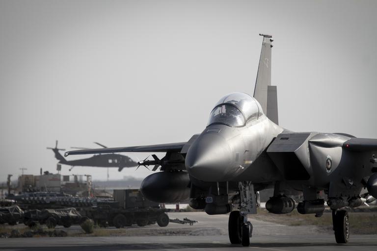 | Keywords: u.s. air force usairforce u.s. army usarmy rc east rceast rce oef operation enduring freedom operationenduringfreedom afghanistan bagram baf usaf air force airforce cas close air support closeairsupport military photo f-15e f15e strike eagle strikeeagle airman airmen maintenance army 335th fighter squadron fightersquadron 335th fighter squadron 335thfightersquadron strike eagle fighter squadron operation enduring freedom f-15 f15 afterburner take off airplane aircraft combat close air support aviation conflict pilot pilots weapons bombs creative commons royalty free public domain photograph digital matt hecht getty reuters ap vehicle outdoor A U.S. Air Force F-15E Strike Eagle from the 335th Expeditionary Fighter Squadron taxis while a U.S. Army Black Hawk helicopter takes off from Bgram Air Field on Sept. 30, 2011. (U.S. Air National Guard photo by Tech. Sgt. Matt Hecht/Released) A U.S. Air Force F-15E Strike Eagle from the 335th Expeditionary Fighter Squadron taxis while a U.S. Army Black Hawk helicopter takes off from Bgram Air Field on Sept. 30, 2011. (U.S. Air National Guard photo by Tech. Sgt. Matt Hecht/Released) |