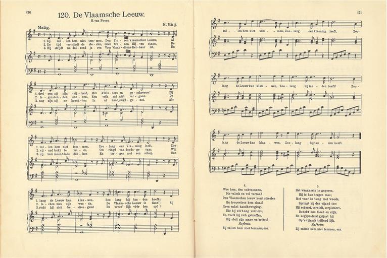 Keywords: 120 De Vlaamsche Leeuw, pagina 170 & 171.jpg Kun je nog zingen zing dan mee Muziek en teksten origineel gepubliceerd voor 1900 own 1915 author PD-old Kun je nog zingen zing dan mee