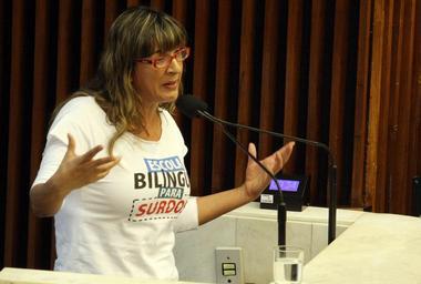 | Keywords: sessão plenária sessãoplenária sueli fernandes suelifernandes indoor Professora Sueli Fernandes, da Federação Nacional de Educação e Integração dos Surdos (Feneis/PR), em pronunciamento na sessão plenária desta segunda-feira (12/09). De acordo com a professora, o que se vê, na escola proposta pelo MEC, é a inserção de crianças surdas, em geral, sem contato prévio com nenhuma língua, nem português nem Libras, em salas onde o meio de instrução é o português. O evento atendeu a uma proposição do deputado Professor Lemos (PT), que considera fundamental o debate, especialmente para que a população adquira consciência e respeite a pessoa surda. Foto: Nani Gois/Alep (crédito obrigatório) Professora Sueli Fernandes, da Federação Nacional de Educação e Integração dos Surdos (Feneis/PR), em pronunciamento na sessão plenária desta segunda-feira (12/09). De acordo com a professora, o que se vê, na escola proposta pelo MEC, é a inserção de crianças surdas, em geral, sem contato prévio com nenhuma língua, nem português nem Libras, em salas onde o meio de instrução é o português. O evento atendeu a uma proposição do deputado Professor Lemos (PT), que considera fundamental o debate, especialmente para que a população adquira consciência e respeite a pessoa surda. Foto: Nani Gois/Alep (crédito obrigatório) |