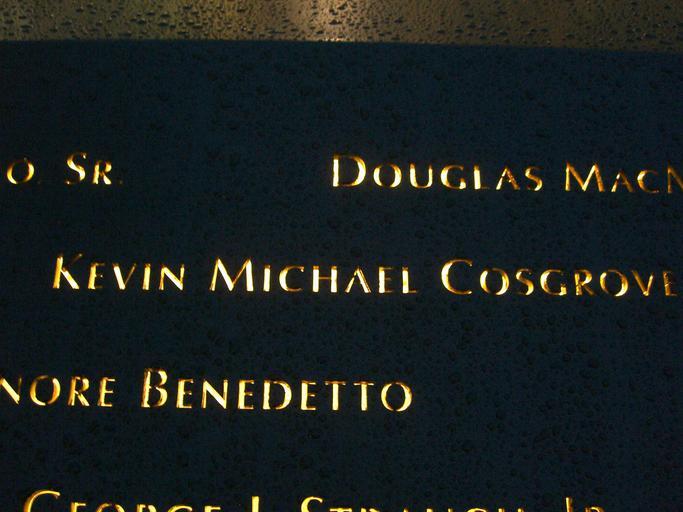 | Keywords: 12.6.11KevinCosgrovePanelS-60ByLuigiNovi3.jpg Kevin Cosgrove is seen among those of other people inscribed on bronze panel S-60 of the South Pool of the National September 11 Memorial in Manhattan as seen on December 6 2011 This photo was created by Luigi Novi You can see a gallery of some of my other photos here If you have any questions you can contact me by sending me an email or User talk Nightscream own Nightscream 2011-12-06 Cc-zero Kevin Cosgrove National September 11 Memorial South Pool name panels |