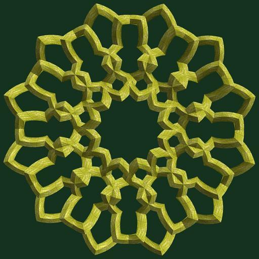 Keywords: mathematica 3d cg parametricplot3d texture torus code program algorithm プログラム コード アルゴリズム 輪環 りんかん ドーナツ どーなつ 六芒星 ろくぼうせい geometric sculpture geometricsculpture shape geometry sculpture mapping テクスチャ マッピング 模様 もよう abstract 抽象 ちゅうしょう アブストラクト design pattern デザイン パターン graphic グラフィック グラフィクス structure 意匠 構造 symmetry 対称性 たいしょうせい シンメトリー 対称 たいしょう black background a = 7; (* center hole size *) b = 6; (* hexa-torus *) c = 10; (* distance from the center of rotation *) d = 12; (* number of torus *) h = 2; (* height of a torus *) SetOptions[ParametricPlot3D, PlotRange -> Full, Mesh -> None, Boxed -> False, Axes -> False, PlotPoints -> 400, ImageSize -> 3000, Background -> RGBColor[{20, 50, 30}/255], PlotStyle -> Directive[Specularity[White, 30], Texture[Import["D:/tmp/71.jpg"]]], TextureCoordinateFunction -> ({#4, #5 Pi} &), Lighting -> "Neutral"]; f[v_] := TriangleWave[{-1, 1}, v/(2 Pi)]; g[v_] := TriangleWave[{-1, 1}, v/(2 Pi) + 1/4]; x = (a - g[t] - f[b s]) Cos[s] + c; y = (a - g[t] - f[b s]) Sin[s] + c; z = (a - f[t] - h f[b s]); rm = Table[{x, y, z}.RotationMatrix[2 i Pi/d, {0, 0, 1}], {i, d}]; ParametricPlot3D[rm, {t, 0, 2 Pi}, {s, 0, Pi}] (*--- The Texture *) a = 7; (* center hole size *) b = 6; (* hexa-torus *) c = 10; (* distance from the center of rotation *) d = 12; (* number of torus *) h = 2; (* height of a torus *) SetOptions[ParametricPlot3D, PlotRange -> Full, Mesh -> None, Boxed -> False, Axes -> False, PlotPoints -> 400, ImageSize -> 3000, Background -> RGBColor[{20, 50, 30}/255], PlotStyle -> Directive[Specularity[White, 30], Texture[Import["D:/tmp/71.jpg"]]], TextureCoordinateFunction -> ({#4, #5 Pi} &), Lighting -> "Neutral"]; f[v_] := TriangleWave[{-1, 1}, v/(2 Pi)]; g[v_] := TriangleWave[{-1, 1}, v/(2 Pi) + 1/4]; x = (a - g[t] - f[b s]) Cos[s] + c; y = (a - g[t] - f[b s]) Sin[s] + c; z = (a - f[t] - h f[b s]); rm = Table[{x, y, z}.RotationMatrix[2 i Pi/d, {0, 0, 1}], {i, d}]; ParametricPlot3D[rm, {t, 0, 2 Pi}, {s, 0, Pi}] (*--- The Texture *) |