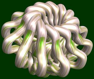 | Keywords: mathematica 3d cg parametricplot3d texture torus 輪環 りんかん ドーナツ どーなつ 四芒星 しぼうせい 四光星 しこうせい 四稜星 しりょうせい プログラム コード code program algorithm コード アルゴリズム geometric sculpture geometricsculpture shape geometry sculpture mapping テクスチャ マッピング 模様 もよう design pattern デザイン パターン graphic グラフィック グラフィクス structure 意匠 構造 symmetry 対称性 たいしょうせい シンメトリー 対称 たいしょう algorithm SetOptions[ParametricPlot3D, PlotRange -> Full, Mesh -> None, Boxed -> False, Axes -> None, PlotPoints -> 300, ImageSize -> 3000, Background -> Darker[Green, 0.8], PlotStyle -> Directive[Specularity[White, 30], Texture[Import["D:/tmp/862.jpg"]]], TextureCoordinateFunction -> ({#4 + #5, #5/Pi} &), Lighting -> "Neutral"]; a = 5; (* center hole size of a torus *) b = 4; (* tetra-torus *) c = 3; (* distance from the center of rotation *) d = 12;(* number of torus *) f[v_] := Sin[2 Sin[Sin[Sin[v]]]]; x = (a - Cos[t] - f[b s]) Cos[s + Pi/(2 b)] + c; y = Sin[t] + c; z = (a - Cos[t] - f[b s]) Sin[s + Pi/(2 b)] + c; rot = Table[{x, y, z}.RotationMatrix[2 i Pi/d, {1, 0, 0}], {i, d}]; ParametricPlot3D[rot, {t, 0, 2 Pi}, {s, 0, 2 Pi}] (* --- The Texture *) SetOptions[ParametricPlot3D, PlotRange -> Full, Mesh -> None, Boxed -> False, Axes -> None, PlotPoints -> 300, ImageSize -> 3000, Background -> Darker[Green, 0.8], PlotStyle -> Directive[Specularity[White, 30], Texture[Import["D:/tmp/862.jpg"]]], TextureCoordinateFunction -> ({#4 + #5, #5/Pi} &), Lighting -> "Neutral"]; a = 5; (* center hole size of a torus *) b = 4; (* tetra-torus *) c = 3; (* distance from the center of rotation *) d = 12;(* number of torus *) f[v_] := Sin[2 Sin[Sin[Sin[v]]]]; x = (a - Cos[t] - f[b s]) Cos[s + Pi/(2 b)] + c; y = Sin[t] + c; z = (a - Cos[t] - f[b s]) Sin[s + Pi/(2 b)] + c; rot = Table[{x, y, z}.RotationMatrix[2 i Pi/d, {1, 0, 0}], {i, d}]; ParametricPlot3D[rot, {t, 0, 2 Pi}, {s, 0, 2 Pi}] (* --- The Texture *) |