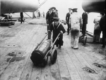| Keywords: 12inchShellOnDeckHMASAustraliaWWI.jpg IWM caption An unidentified gunner pushes a trolley holding an artillery shell for one of the 12 inch guns on board HMAS Australia EN0529 Credit line Donor Associated News Agency circa 1914-1918 Photographer not identified PD-AustraliaGov DEFAULTSORT Australia Sailors of the Royal Australian Navy AUSTRALIA BL 12 inch Mk X naval gun Black and white photographs World War I artillery ammunition BL 12 inch HMAS Australia 1911 Wheelbarrows | ||||