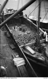 | Keywords: 132144 WOODEN LIGHTERS CARRYING MUSTARD GAS CONTAINERS MOORED ALONGSIDE THE SHIP SHINTONMARU.JPG en OKUNOSHIMA JAPAN WOODEN LIGHTERS CARRYING MUSTARD GAS CONTAINERS MOORED ALONGSIDE THE SHIP SHINTONMARU A WINCH IS HOISTING THEM ABAORD IN BATCHES OF SIX BECAUSE OF THE DANGEROUS NATURE OF THIS JOB JAPANESE WORKMEN WEAR PROTECTIVE CLOTHING AS THEY STOW THE CONTAINERS IN THE SHIP'S HOLD THE CONTAINERS WILL BE DESTROYED LATER AT SEA DURING THE FINAL PHASES OF OPERATION LEWISITE UNDER THE SUPERVISON OF DIRECTOR OF ENGINEERING EQUIPMENT BCOF 132144 Queale Alan 1946-10-03 Copyright expired - public domain PD-AustraliaGov Chemical weapons in Okunoshima 1946-1947 British Commonwealth Occupation Force |