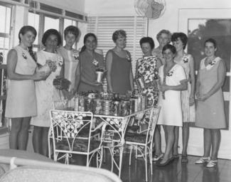 | Keywords: christmas blackandwhite monochrome indoor black and white 13-0151 Officers of the Navy Hospital Officers' Wives Club display some of the Christmas packages which the club prepared for patients at U.S.N.H. Guam. The ladies are: from left, Joy Snow, Fran Barnhill, Bunny Fisk, Eleanor Trabaudo, Kay Cowen, Mary Ochs, Peppy Walsh, Ruth Laedtke (extreme background), Angie Lovett, and Sharon Donahoo. 18 December 1969.Photo by HM1 Donald W. Calhoun. 13-0151 Officers of the Navy Hospital Officers' Wives Club display some of the Christmas packages which the club prepared for patients at U.S.N.H. Guam. The ladies are: from left, Joy Snow, Fran Barnhill, Bunny Fisk, Eleanor Trabaudo, Kay Cowen, Mary Ochs, Peppy Walsh, Ruth Laedtke (extreme background), Angie Lovett, and Sharon Donahoo. 18 December 1969.Photo by HM1 Donald W. Calhoun. |