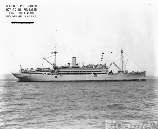 | Keywords: nurse corps nursecorps world war ii worldwarii world war 2 worldwar2 hospital ship uss bountiful (ah-9) hospitalshipussbountifulah9 history hospital ship hospitalship uss bountiful ussbountiful blackandwhite monochrome outdoor boat vehicle ship black and white USS Bountiful (AH-9) Broadside. Alterations circled on M.I. Photos No. 1831-44 to 1831-44 inc. San Francisco, Cal. 27 March 1944. Navy Yard Mare Island, Calif. [hospital ship, World War II, World War 2] 14-0057-003 USS Bountiful (AH-9) Broadside. Alterations circled on M.I. Photos No. 1831-44 to 1831-44 inc. San Francisco, Cal. 27 March 1944. Navy Yard Mare Island, Calif. [hospital ship, World War II, World War 2] 14-0057-003 |
