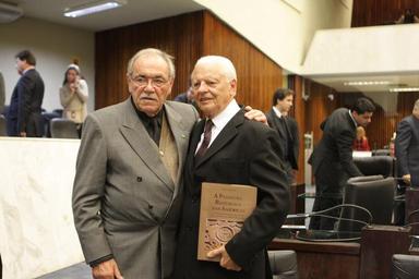 Keywords: Ex-prefeito de Guarapuava e ex-deputado Nivaldo Krüger, e o deputado Duílio Genari (PP) no lançamento do livro “A Primeira República das Américas” na Assembleia Legislativa. Foto: Nani Gois/Alep (crédito obrigatório)