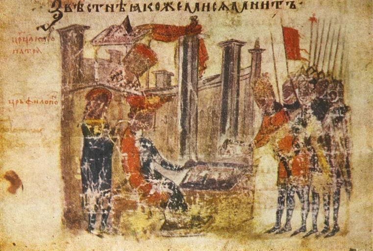 ΡΠ΄ΠΎΠΆΠ½ΠΈΠΊ Π‘ΠΎΡΠΈΡ 1962 Scanned from book Miniatures from the Manasses Chronicle Ivan Duichev Bulgarski hudojnik Publishing house Sofia 1962 Original 14 century Original Constantine Manasses PD-Art PD-Art-100 Constantine Manasses Chronicle Ptolemy Philadelphus Cleopatra |