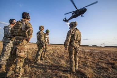 | Keywords: joint training jointtraining training train exercise joint fast-rope insertion extraction system fastropeinsertionextractionsystem fries special purpose insertion extraction system specialpurposeinsertionextractionsystem spies tactical air control party tacticalaircontrolparty tacp 227th air support operations squadron 227thairsupportoperationssquadron 227th asos 227thasos air support operations squadron airsupportoperationssquadron asos new jersey air national guard newjerseyairnationalguard njang air national guard airnationalguard airman airmen uh-60 black hawk uh60blackhawk black hawk blackhawk uh-60 uh60 helicopter 1-150th assault helicopter battalion 1150thassaulthelicopterbattalion 1-150th ahb 1150thahb new jersey army national guard newjerseyarmynationalguard njarng army national guard armynationalguard arng soldier soldiers new jersey national guard newjerseynationalguard njng national guard nationalguard u.s. national guard usnationalguard long range surveillance c company 1-158th cavalry longrangesurveillanceccompany1158thcavalry long range surveillance longrangesurveillance cavalry maryland army national guard marylandarmynationalguard joint base mcguire-dix-lakehurst jointbasemcguiredixlakehurst jb mdl jbmdl new jersey newjersey n.j. nj united states air force unitedstatesairforce usaf air force airforce af united states army unitedstatesarmy usa army u.s. military usmilitary military photo by master sgt. mark c. olsen photobymastersgtmarkcolsen april 21 2015 april212015 u.s. us outdoor tree plant Airmen with the 227th Air Support Operations Squadron, New Jersey Air National Guard, prepare for an extraction exercise at Joint Base McGuire-Dix-Lakehurst, N.J., April 21, 2015. The 227th were recertified on Fast-Rope Insertion Extraction System (FRIES) training by Soldiers from the Long Range Surveillance C Company, 1-158th Cavalry, Maryland Army National Guard. This was the first time the 1-150th Assault Helicopter Battalion, New Jersey Army National Guard, has performed FRIES training with their own helicopters and equipment in New Jersey. FRIES is used when a fast exit from a rotary-wing aircraft into a restricted area, including water operations, is required. It provides a method for inserting and extracting special operations forces personnel when an aircraft cannot land. (U.S. Air National Guard photo by Master Sgt. Mark C. Olsen/Released) Airmen with the 227th Air Support Operations Squadron, New Jersey Air National Guard, prepare for an extraction exercise at Joint Base McGuire-Dix-Lakehurst, N.J., April 21, 2015. The 227th were recertified on Fast-Rope Insertion Extraction System (FRIES) training by Soldiers from the Long Range Surveillance C Company, 1-158th Cavalry, Maryland Army National Guard. This was the first time the 1-150th Assault Helicopter Battalion, New Jersey Army National Guard, has performed FRIES training with their own helicopters and equipment in New Jersey. FRIES is used when a fast exit from a rotary-wing aircraft into a restricted area, including water operations, is required. It provides a method for inserting and extracting special operations forces personnel when an aircraft cannot land. (U.S. Air National Guard photo by Master Sgt. Mark C. Olsen/Released) |